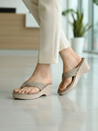 Elevate your everyday style with these beige crystal embellished wedge thong sandals for women, designed to offer both glamour and all-day comfort. The soft cushioned footbed provides superior support, while the stylish wedge heel ensures stability and effortless wearability.