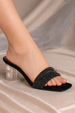 Step into timeless elegance with these black embellished block heels for women, crafted for festive glam and comfort. Designed with a crystal-clear block heel and a beautifully textured black strap adorned with fine embellishments, these heels are a perfect blend of luxury and stability.