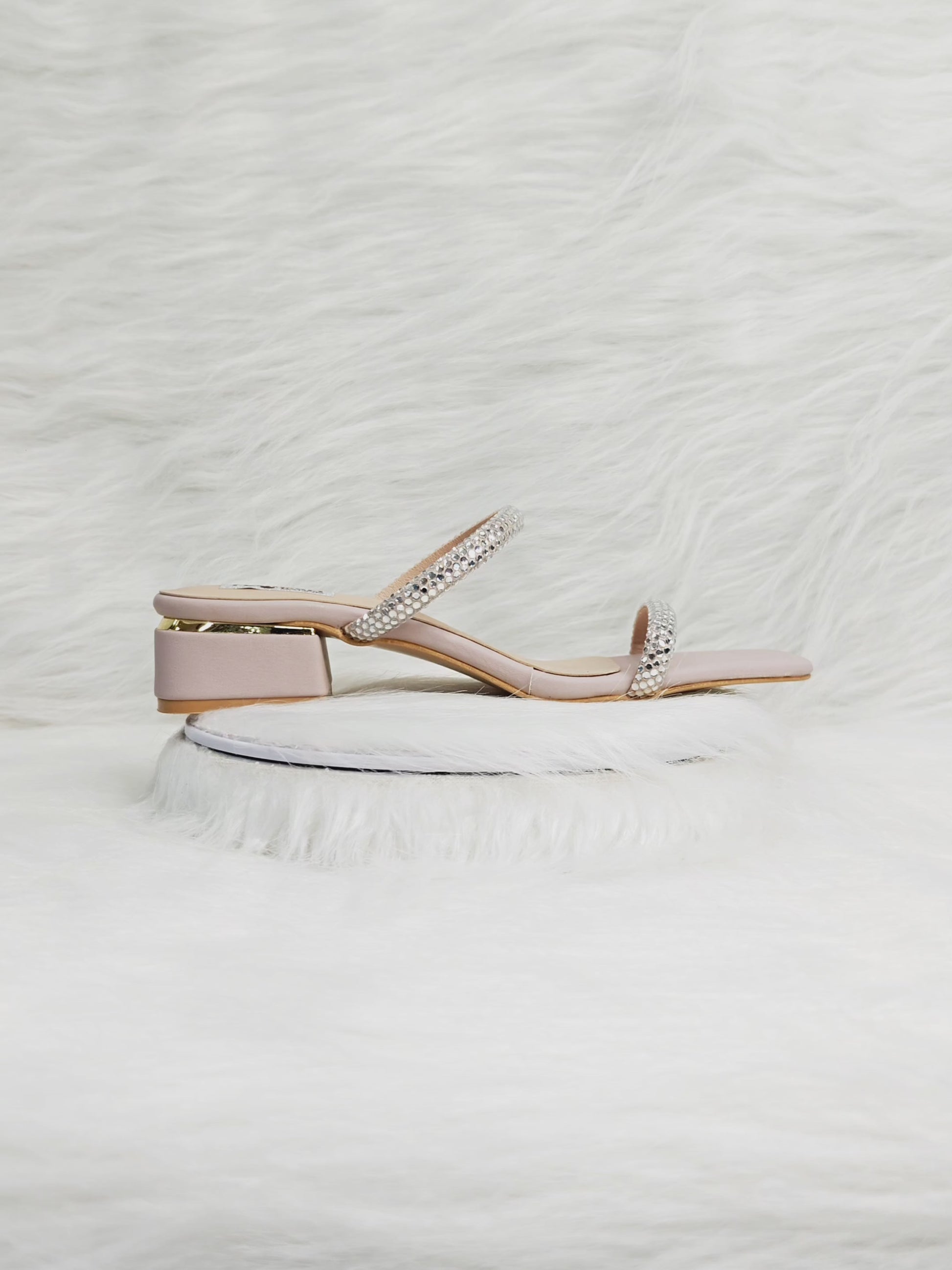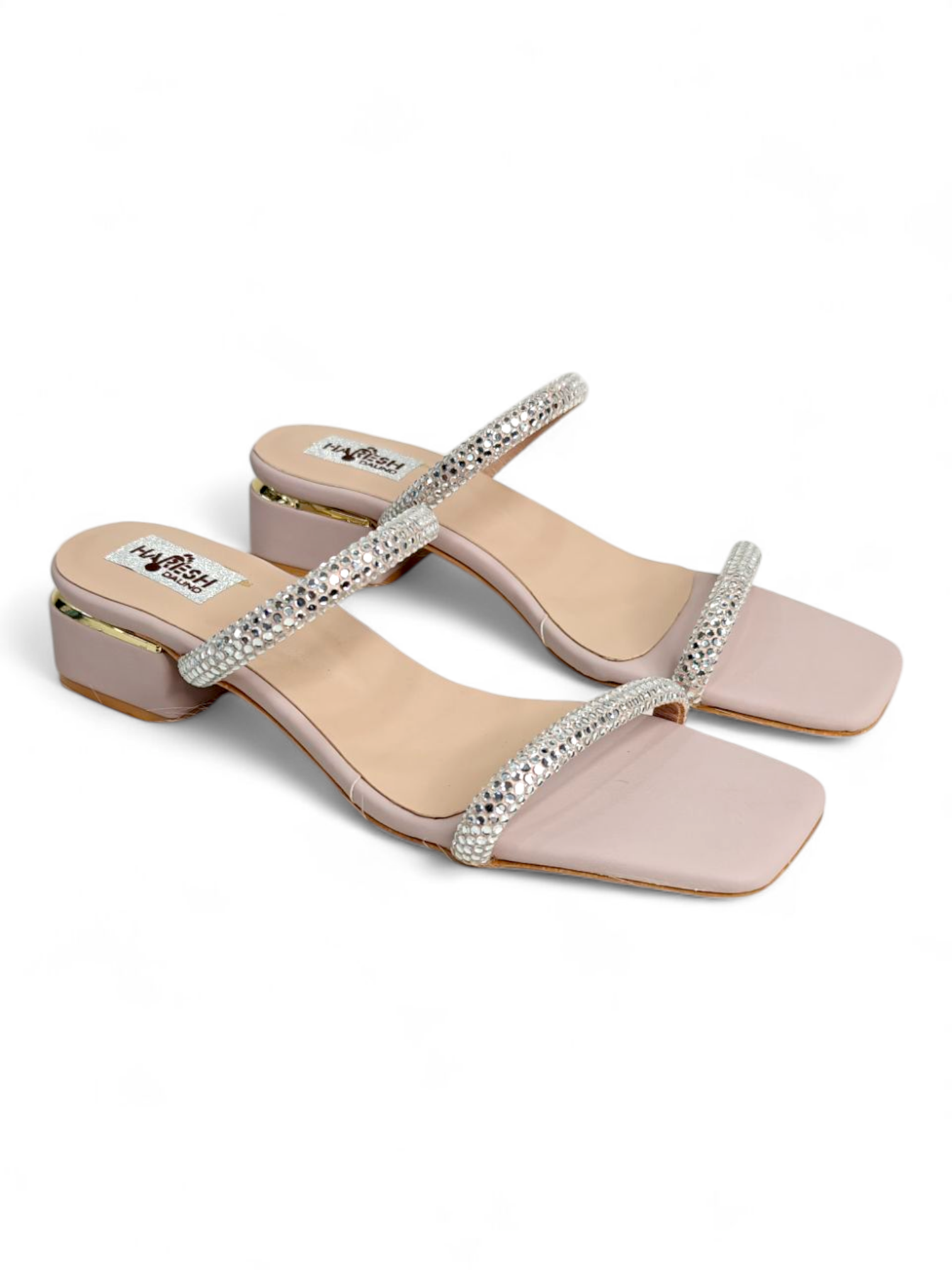 These nude double-strap block heel sandals offer the perfect blend of comfort and glamour. The shimmering crystal embellishments make them ideal for festive wear, while the low heel ensures all-day comfort. Pair them with sarees, gowns, kurtis, or western outfits for an effortlessly elegant look.
