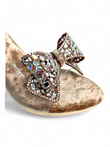 These gold velvet heels with an embellished bow and transparent strap bring unmatched glamour. The designer cube heel adds a luxurious touch, making them perfect for weddings, receptions, festive celebrations, and special occasions. Pair with sarees, lehengas, gowns, or Indo-western outfits to elevate any look.