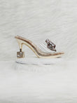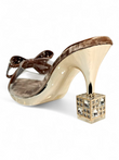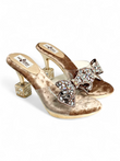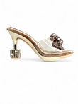 Gold Velvet Embellished Bow Heels with Transparent Strap & Designer Cube Heel