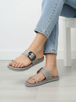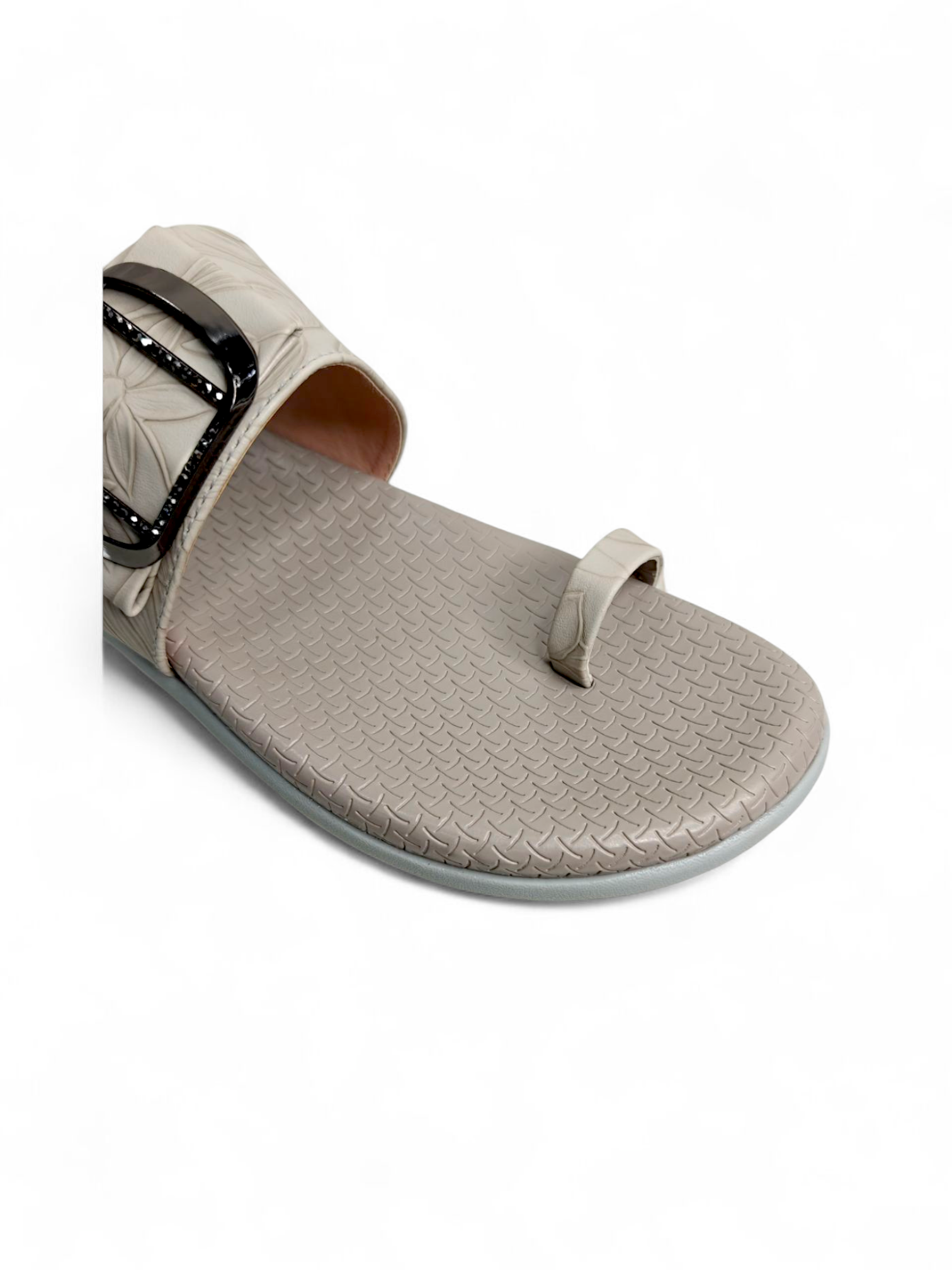 Step out in comfort and class with these beige flat toe-ring sandals featuring a chic floral buckle strap and cushioned sole for all-day wear.